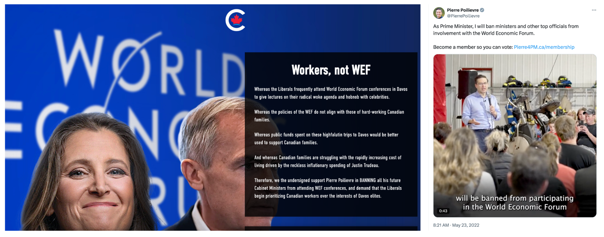 There’s something poetic about Carney’s presumably historic speech happening at the World Economic Forum, one of the villains of the Twittered right. If you’re unfamiliar with the WEF/Great Reset conspiracy theory, bless you. It argues that the global elite, led by the World Economic Forum, planned the pandemic to trigger economic collapse and establish a socialist world government. This is a conspiracy theory Pierre Poilievre was (and is) more than happy to take advantage of.